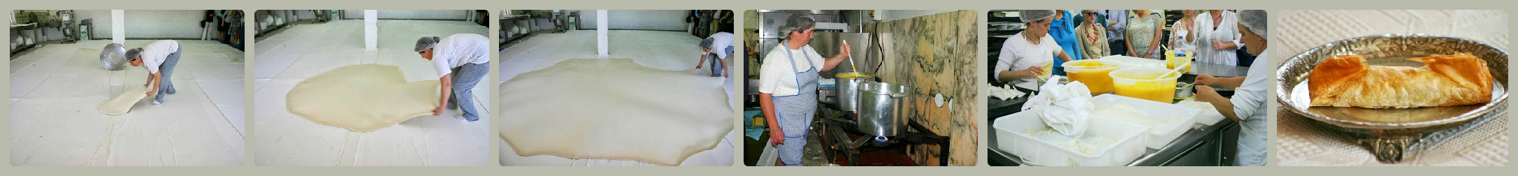 Começando com um disco de cerca de 50 centímetros a massa vai sendo esticada até atingir a finura que lhe é própria. O movimento dado à massa, provocando ondas manualmente ou com auxílio de panos, ajuda o ar a torná-la mais branca e fina. No final a massa assemelha-se a um papel vegetal que ocupa todo o pavimento da sala e que é recortado em feitio de leque ou meio círculo para formar os “tubos” ou as “meias luas”.