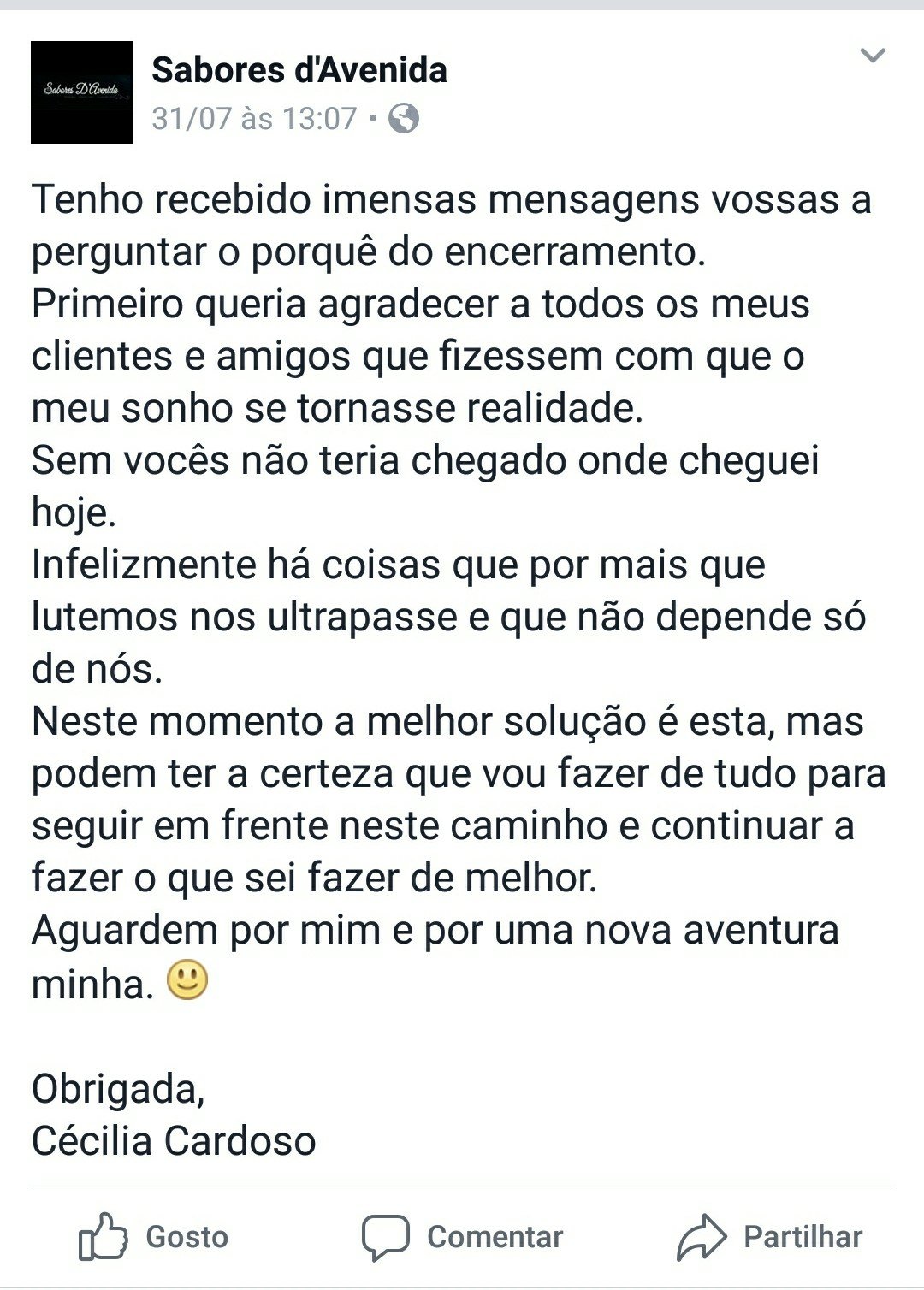 A jovem genial pasteleiro Cecília Cardoso utilizou a página do Facebook da Pastelaria para informar os seus fãs sobre esta decisão não justificando em concreto o porquê mas deixando antever algumas novidades. Assim esperamos!